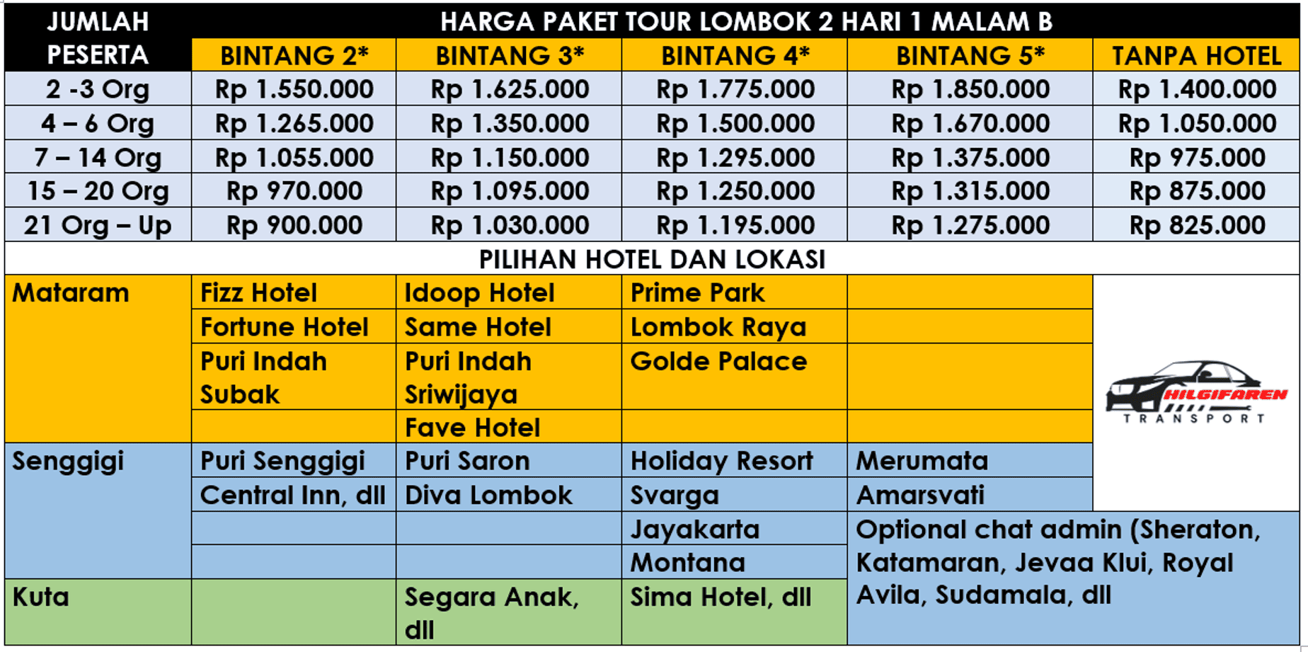 Daftar Harga Paket Tour Lombok 2H1M Terhitung Per Orang Paket B