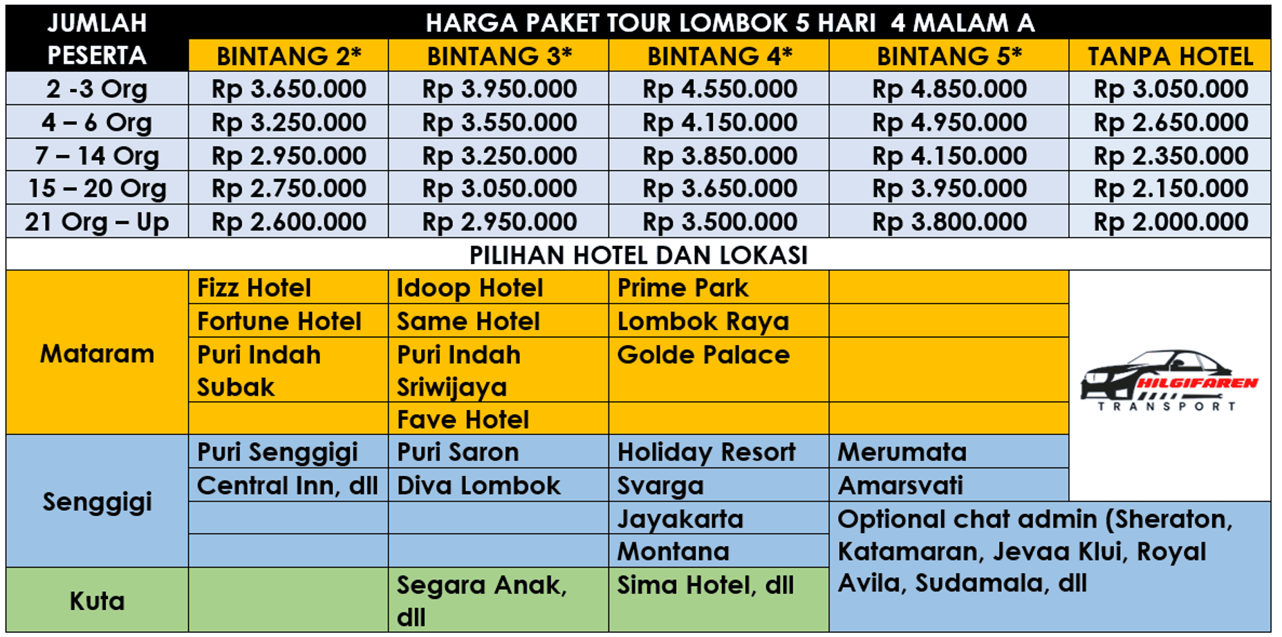 Daftar Harga Paket Tour Lombok 5H4M Terhitung Per Orang Paket A