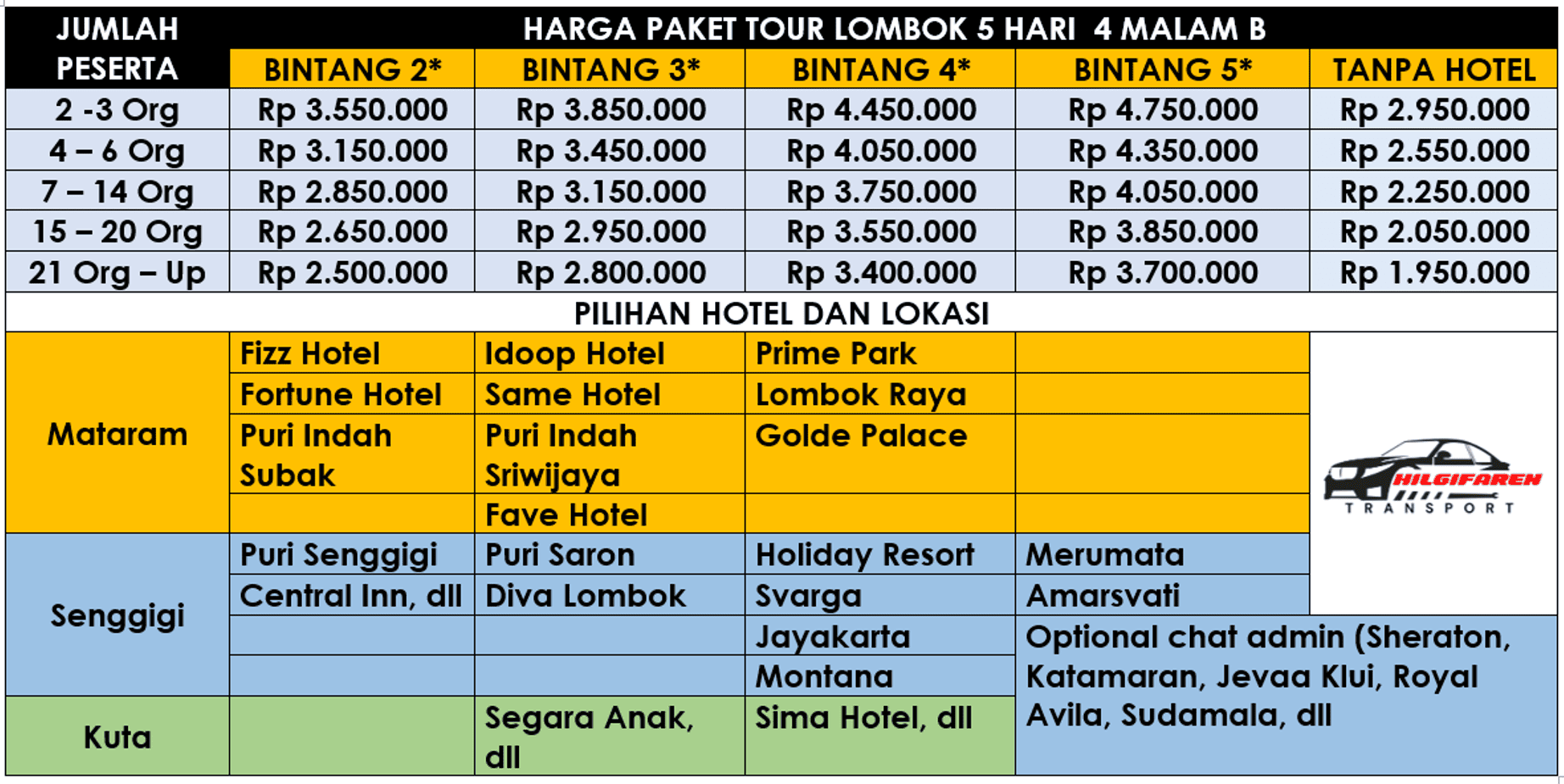 Daftar Harga Paket Tour Lombok 5H4M Terhitung Per Orang Paket B